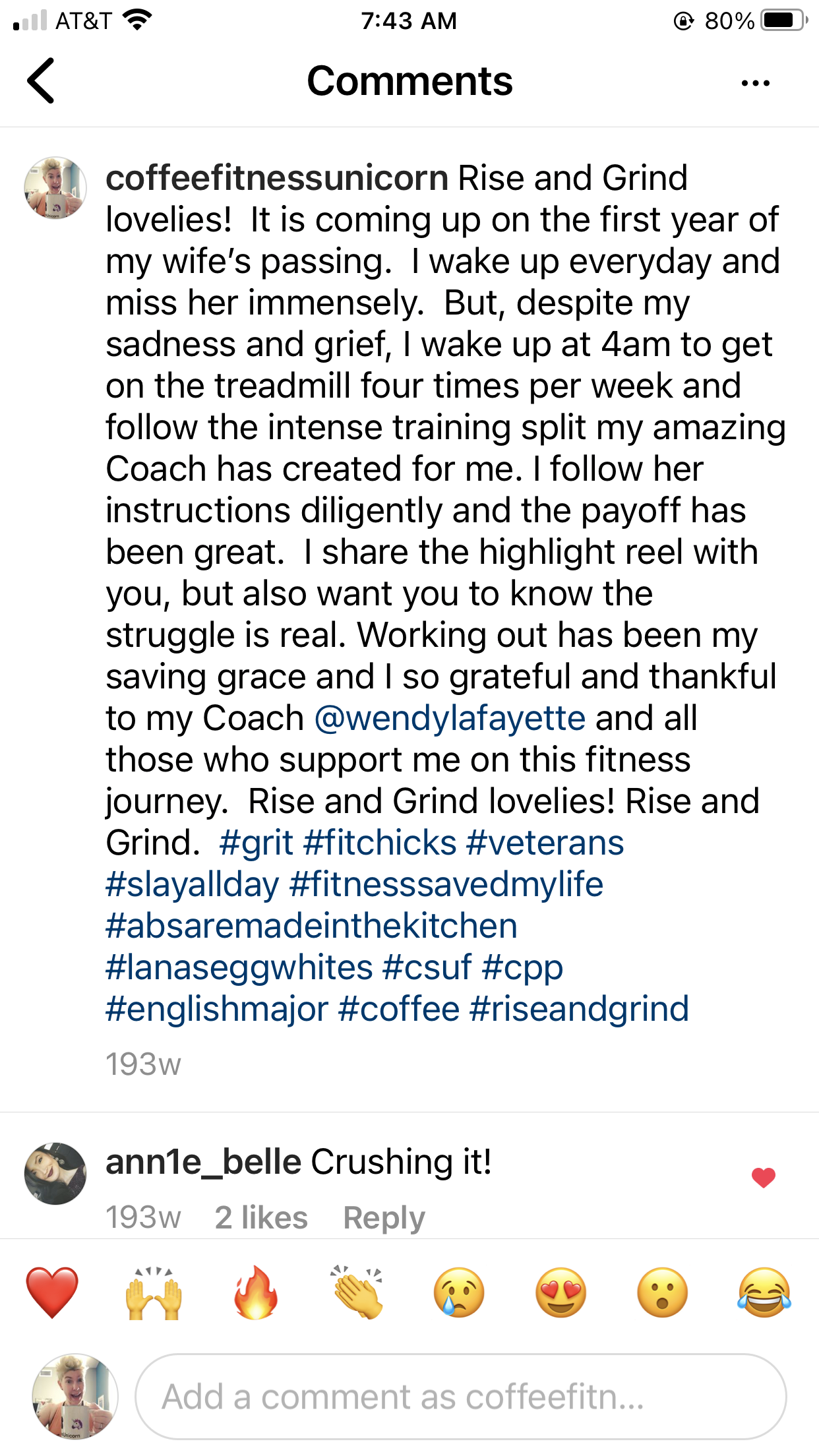 CoffeeFitnessUnicorn was created as a healing tool/persona after becoming a widow and turning to fitness from a coffee-lovers perspective.